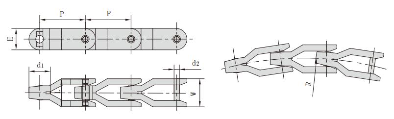 鏈條型號 節(jié)距 銷軸直徑 銷軸長度 鏈板尺寸 側(cè)彎半徑 抗拉強(qiáng)度 每米長重